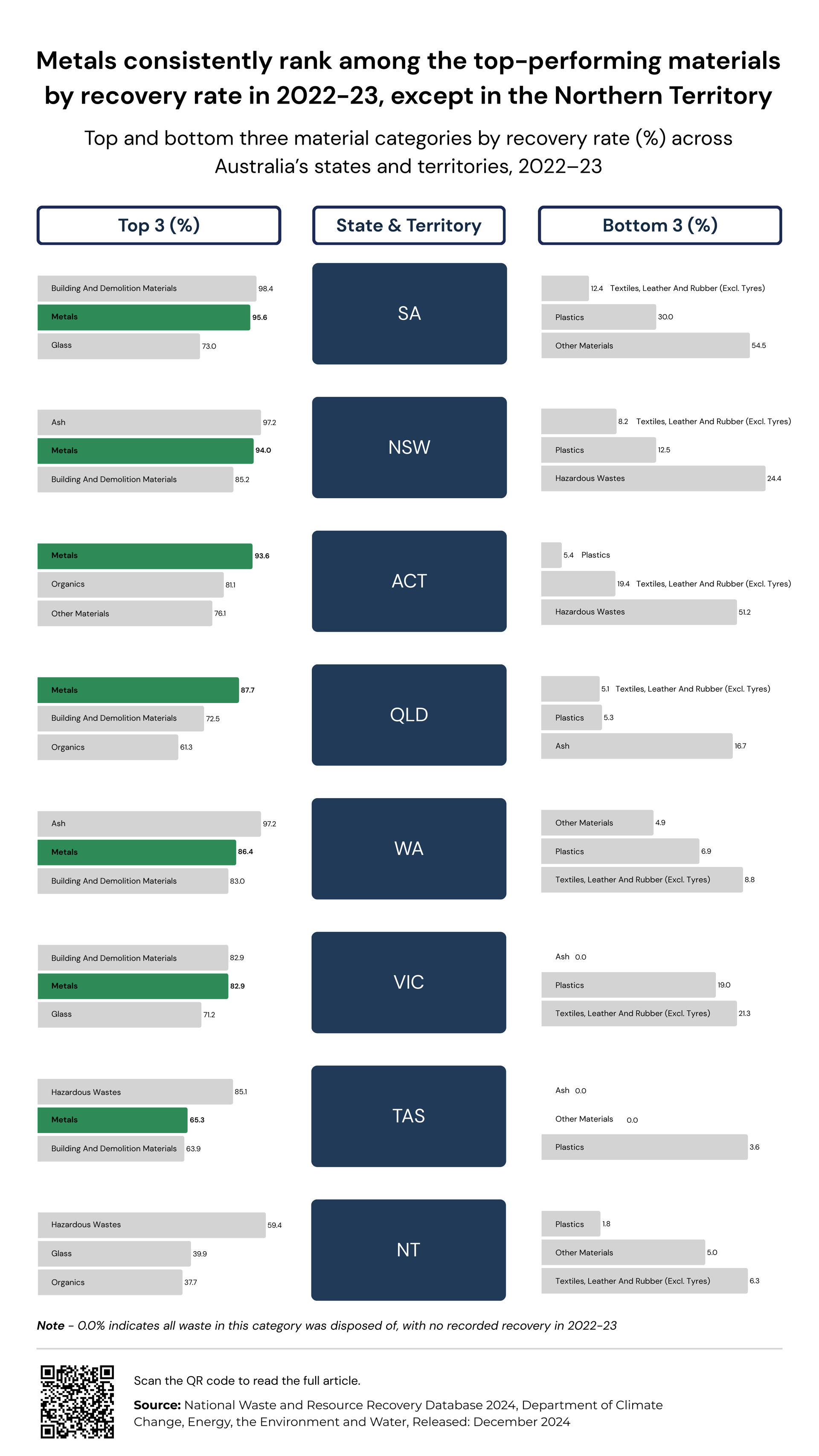 South Australia (SA) leads the nation in metals recovery rate at 95.6%, with NSW and the ACT close behind