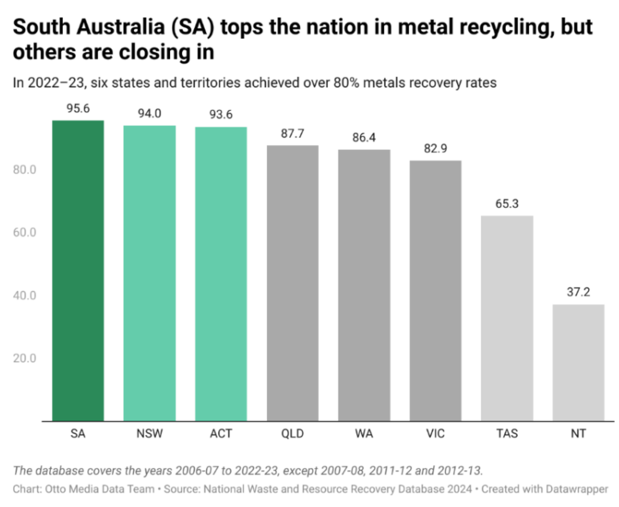 South Australia (SA) leads the nation in metals recovery rate at 95.6%, with NSW and the ACT close behind