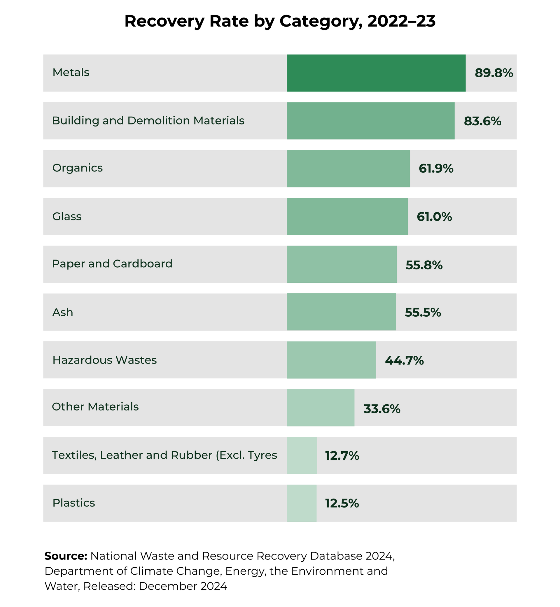 This data comes from the National Waste and Resource Recovery Database 2024, released by the Department of Climate Change, Energy, the Environment and Water (DCCEEW).