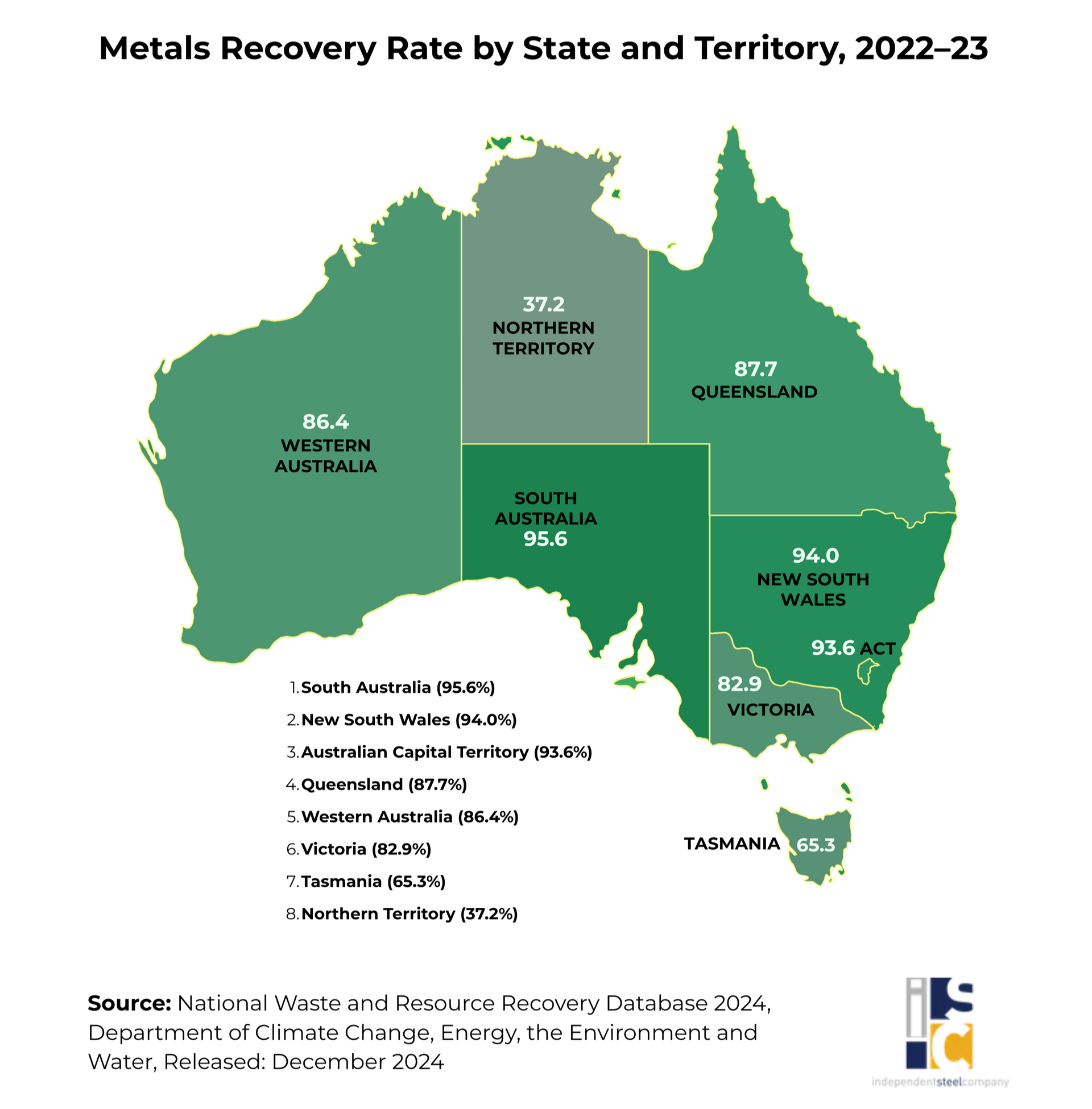 South Australia’s 95.6% metal-recovery rate comes down to consistency. The state has a strong waste policy. They have reliable local infrastructure and a circular-economy mindset. This approach treats scrap as a resource, not as waste (South Australia Waste Strategy 2020–2025, Government of South Australia, Green Industries SA, 2020).